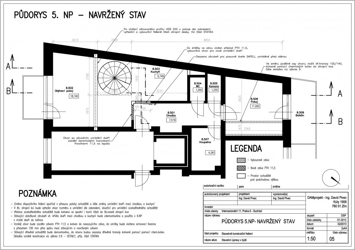 Investorem byl manželský pár, který se rozhodl rekonstruovat svůj mezonetový byt v několik let starém bytovém domě v Suchdole. Důvodem bylo nevhodné dispoziční řešení. V jednom z pokojů bytu o velikosti 4+1 bylo totiž umístěno schodiště do dalšího podlaží a prakticky se tak stával chodbou. Předmětem návrhu bylo zajistit projektovou dokumentaci popisující změnu umístění schodiště a změnu dispozice, aby došlo k lepšímu využití všech prostor. V rámci samotné výstavby investor požadoval kontrolu kvality prací a plnění termínů, což obnáší autorský / technický dozor.