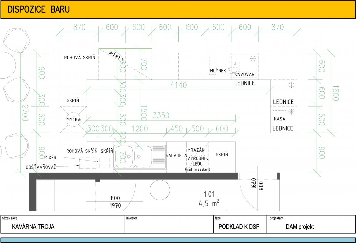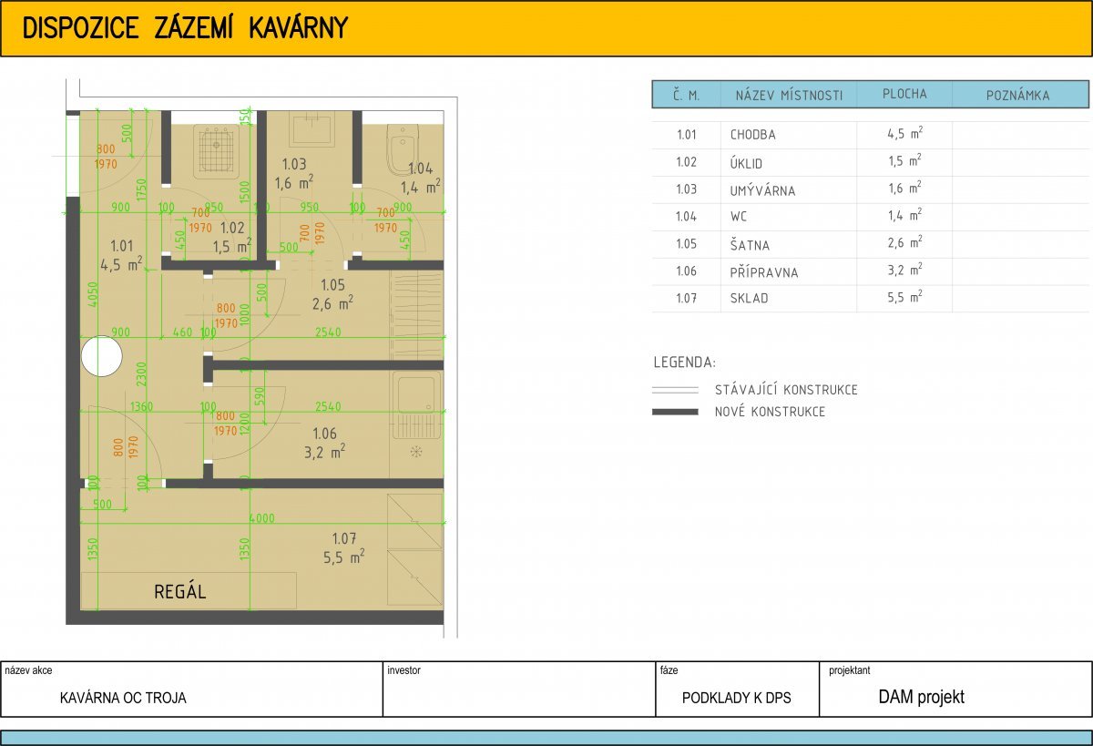 Projekční činnost – návrh dispozice zázemí kavárny, zpracování rozmístění koncových prvků elektroinstalace a rozvodů zdravotechniky
